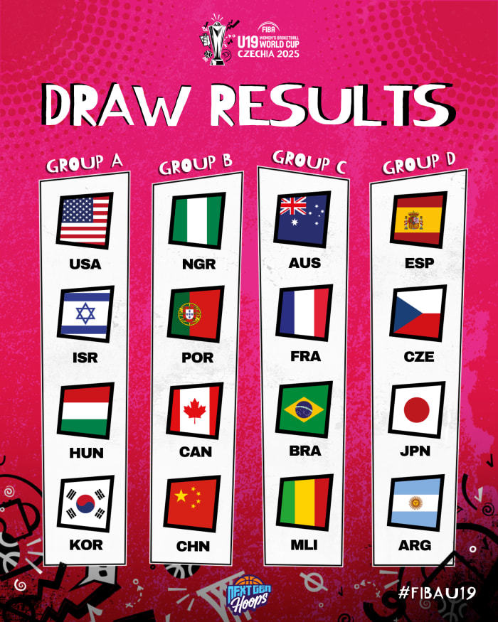 一共有16支来自世界各地的U19队伍将参加7月12日至20日在捷克布尔诺举行的U19女篮世界杯,这16支球队被分为四个小组。A组包括美国队、以色列队、匈牙利队和韩国队,C组是澳大利亚队、法国队、巴西队和马里队,D组是西班牙队、捷克队、日本队和阿根廷队。