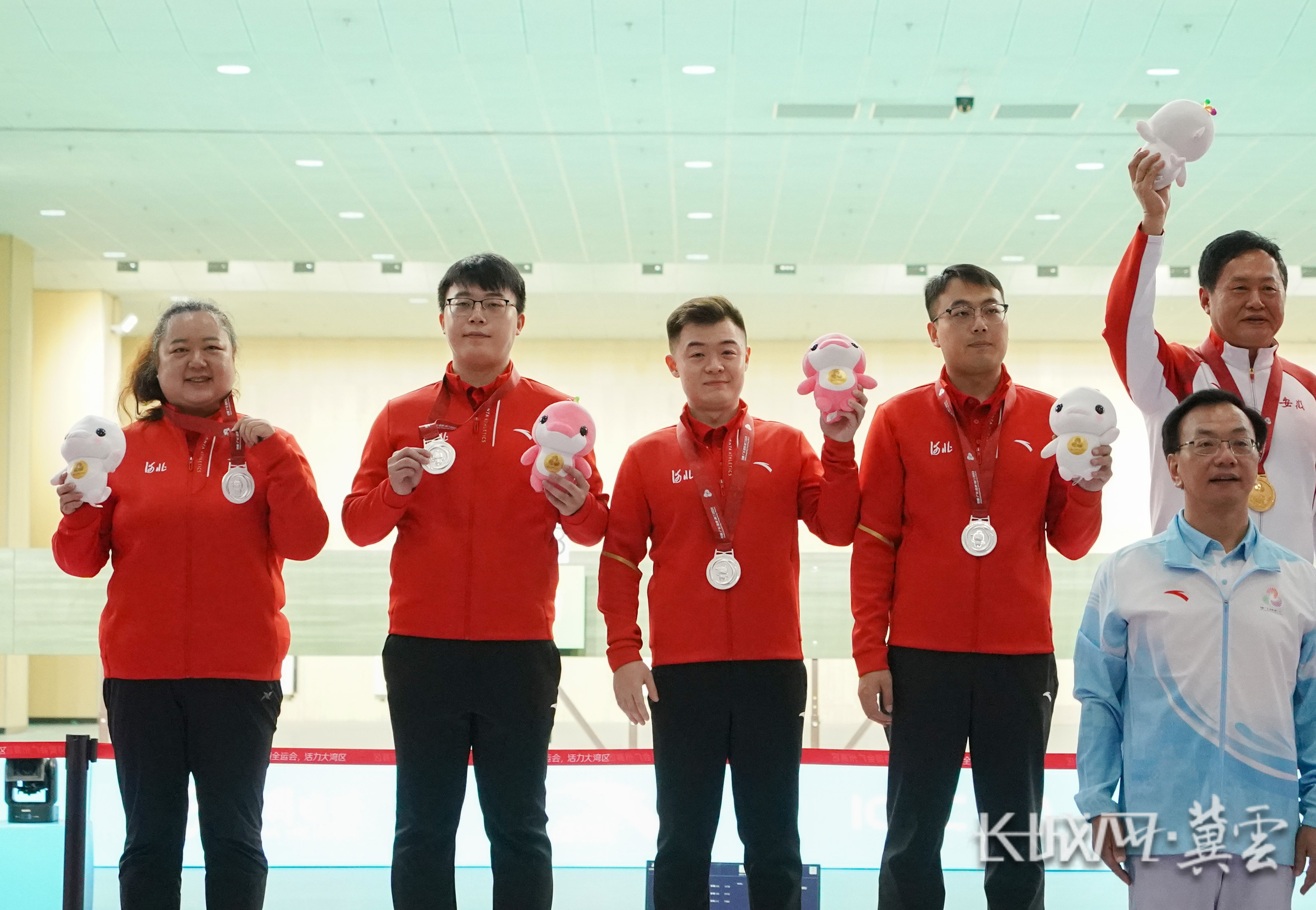 基层教练苗卉(左一)与队员们领取男子10米气手枪团体银牌。长城网·冀云客户端记者 韩颜 摄