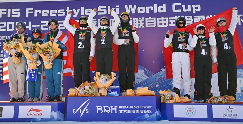 2024-2025赛季自由式滑雪空中技巧世界杯北大湖站24日落幕,中国队共收获3金2银1铜。在当日进行的混合团体比赛中,由徐梦桃、齐广璞、李天马组成的中国一队获得金牌,由陈梅婷、王心迪、李心鹏组成的中国二队摘铜。