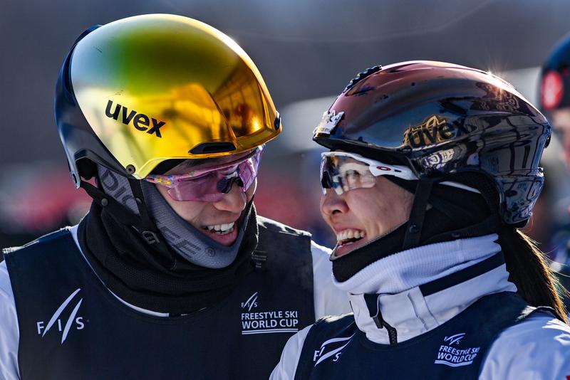 2月24日,中国队李天马(左)与徐梦桃在比赛后庆祝。新华社记者 颜麟蕴 摄