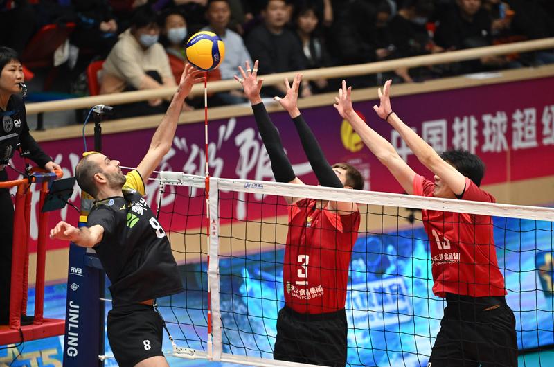 2月27日,保定队球员契罗维奇(左)在比赛中扣球。新华社记者 孙凡越 摄