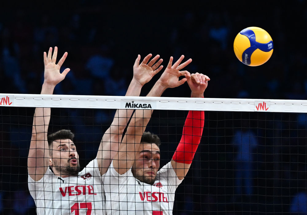 土耳其队球员穆拉特·叶尼帕扎尔(左)、贝迪尔汗·比比尔在比赛中拦网。新华社记者 张博文 摄