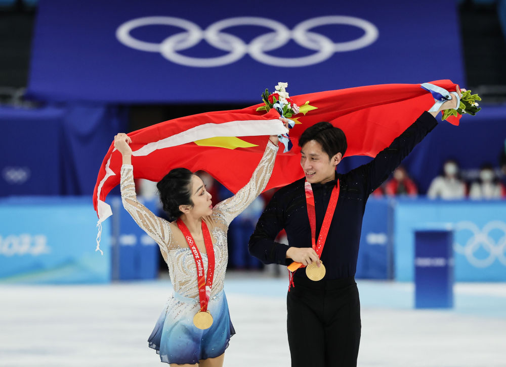 这是2022年2月19日,中国选手隋文静/韩聪(右)在北京2022年冬奥会花样滑冰双人滑奖牌颁发仪式后。新华社记者 曹灿 摄