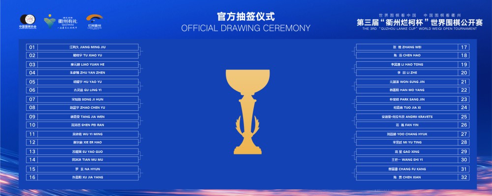 第三届“衢州烂柯杯”世界围棋公开赛6月30日在浙江衢州开幕,48位来自世界各地的棋手参与角逐,当日也举行了首轮出战的32位棋手的对阵抽签。