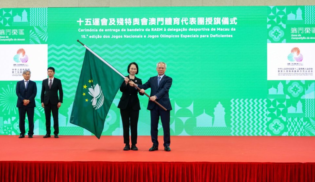 10月11日,第十五届全国运动会和全国第十二届残疾人运动会暨第九届特殊奥林匹克运动会澳门体育代表团授旗仪式暨澳门赛区志愿者誓师大会在澳门望厦体育中心举行。