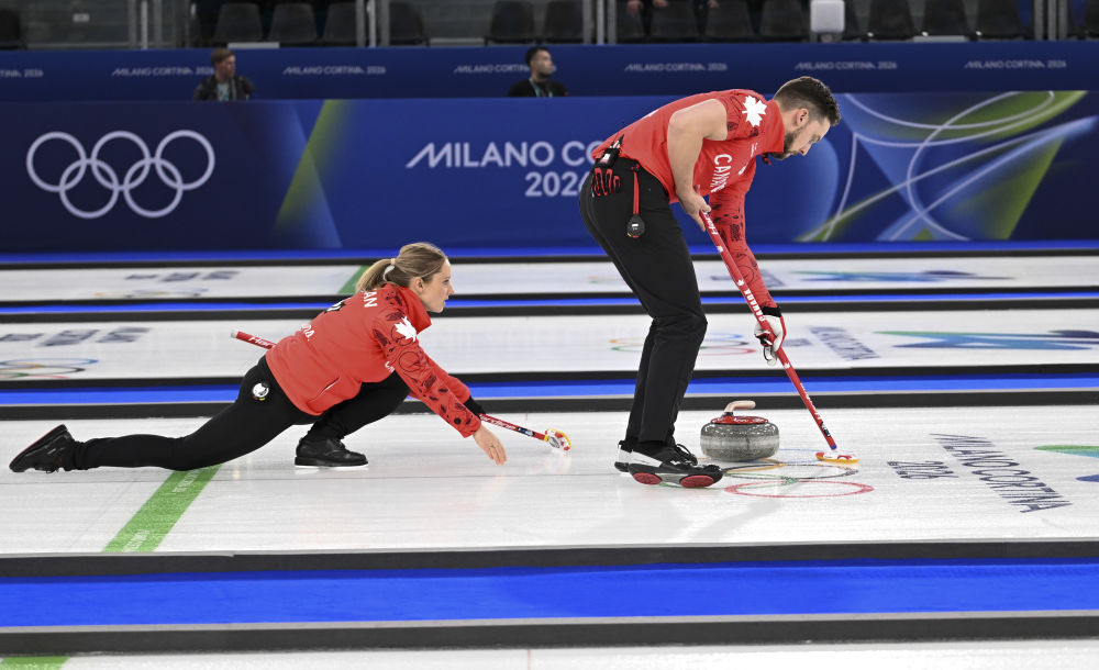 2月4日,加拿大队选手布雷特·加兰特(右)和乔斯琳·彼得曼在对阵捷克队的比赛中。新华社记者 连漪 摄