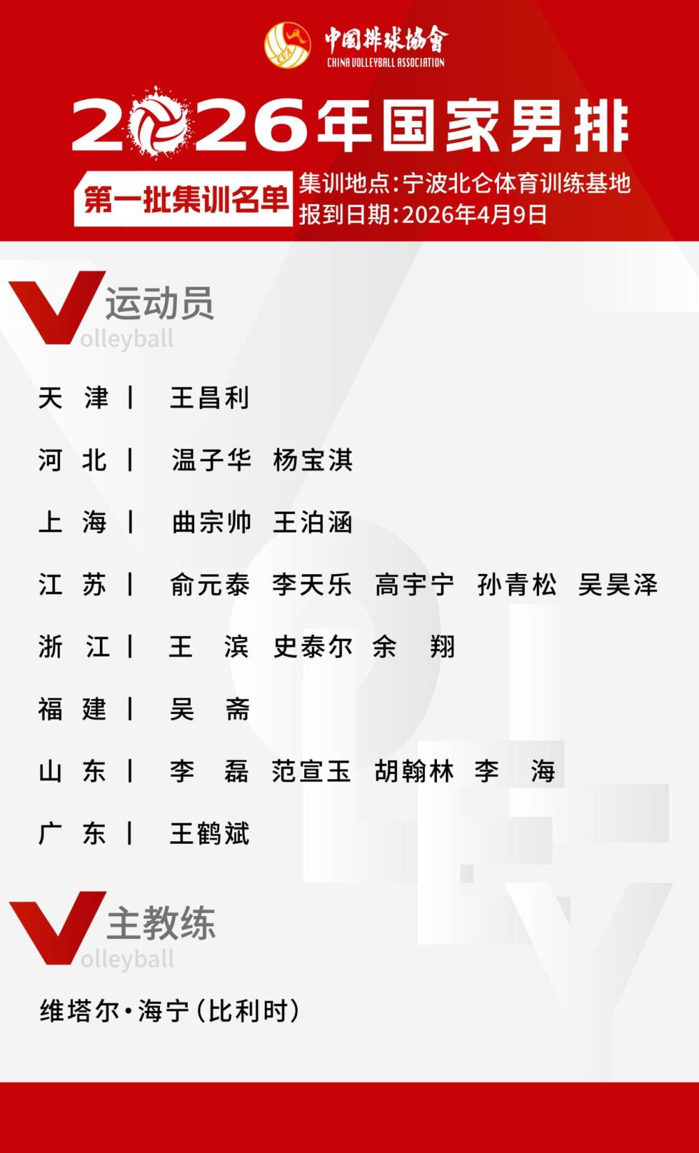 中国排球协会8日公布了2026年中国男排第一批集训名单,队伍将于9日在宁波北仑集结。